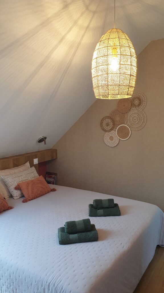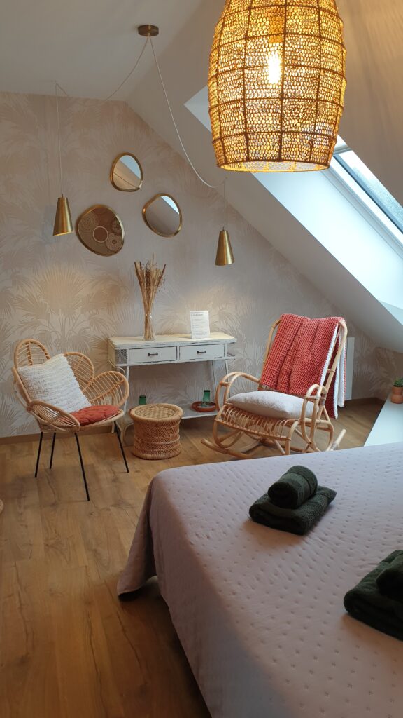 La chambre Palissandre est une véritable invitation au calme et à l’évasion. Son velux balcon inonde la pièce de lumière naturelle, créant une sensation d’espace et d’ouverture sur l’extérieur.