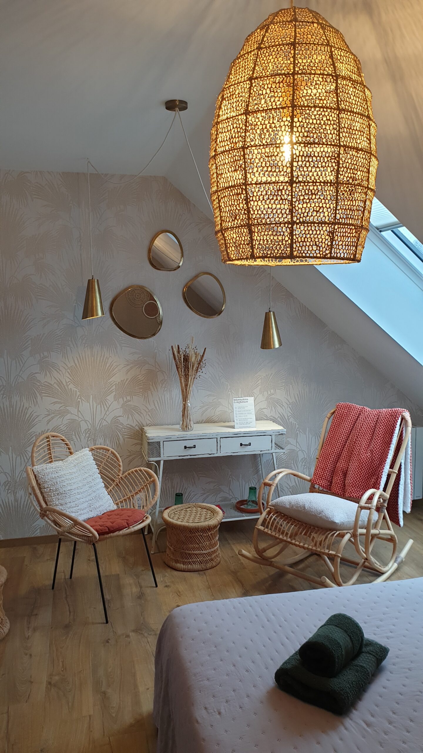 Dans un esprit de campagne contemporaine, les tons blancs, beiges et terre de Sienne, associés à des éléments de vannerie naturelle, donnent vie à une ambiance à la fois authentique, épurée et élégante.